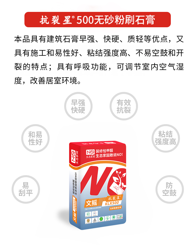 本品是由石膏、碳酸鈣及多種有機添加劑混合而成的新型內墻面基層抹灰材料。具有建筑石膏早強、快硬、質輕等優點,又具有施工和易性好、粘結強度高、不易空鼓和開裂的特點;具有呼吸功能,可調節室內空氣濕度,改善居室環境。本品通過了中國環境標志產品認證,是綠色環保產品。