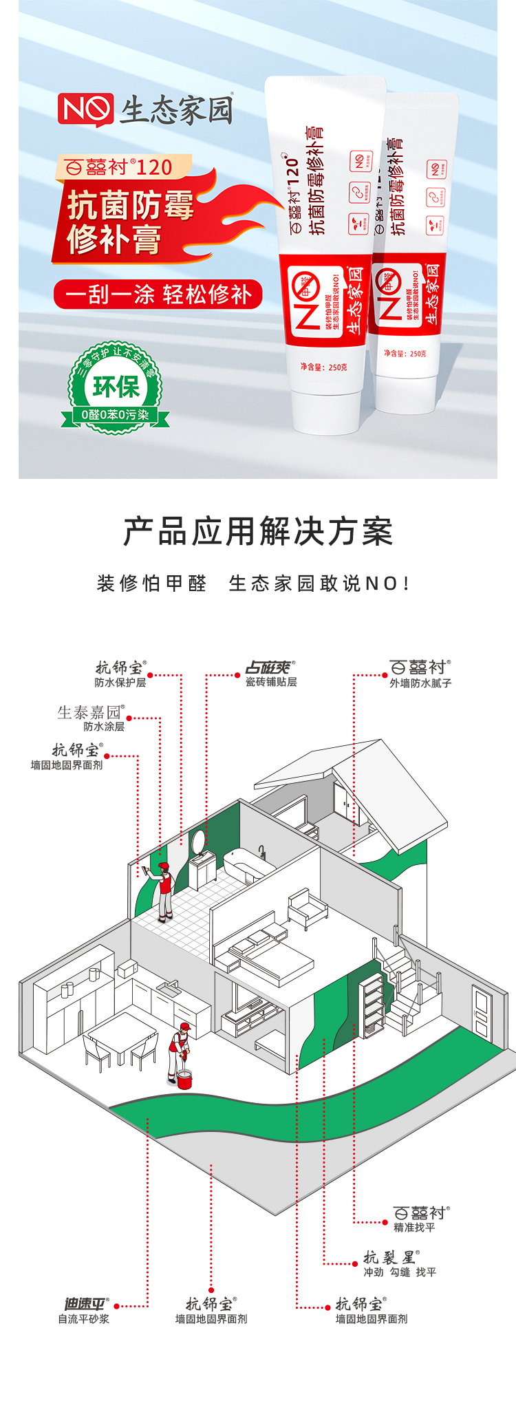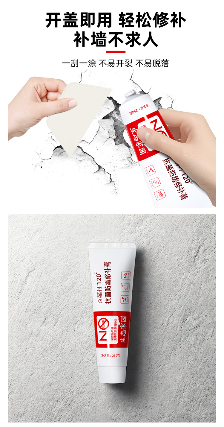 墻面抗菌防霉修補膏采用全新水性環保配方,使用優質原料,結合先進工藝生產而成,新一代環保型底材處理產品。具有良好的防霉耐水功效,用于修補墻面出現的釘眼、小范圍的開裂、孔洞、刮痕、起皮等墻面問題,具有環保健康、0級防霉、耐水性好、附著力強、無須加水,施工方便等優點。本品開蓋即用,批刮后與基層結合牢固,附著力強,細膩平滑,裝飾性好。本品適用于室內墻面乳膠漆涂刷之前的基層平整處理。